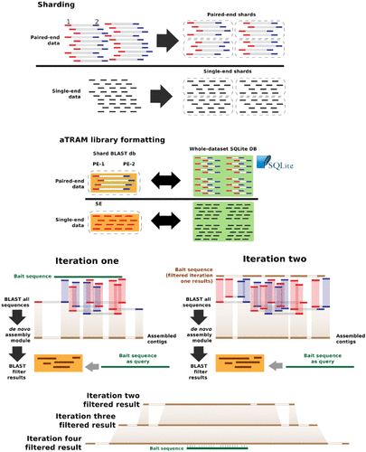 aTRAM: automated Target Restricted Assembly Method – all code and menus can be found here. aTRAM is an iterative assembler that performs reference-guided local de novo assemblies using a variety of available methods. It is well-suited to various tasks where Next-Generation Sequence (NGS) data needs to be queried for gene sequences, such as phylogenomics.